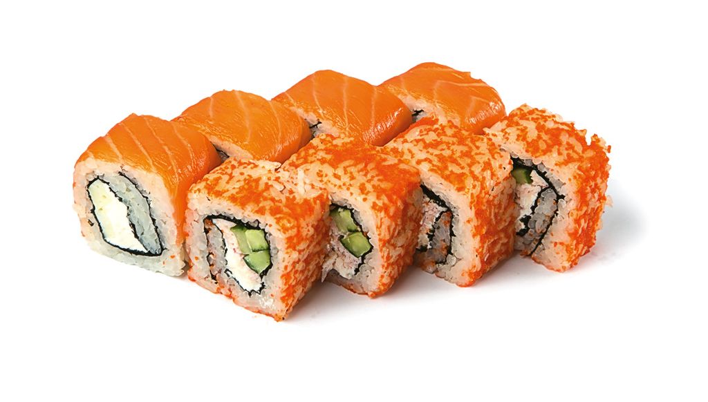 Состав: краб, сыр, огурец, лосось масаго.